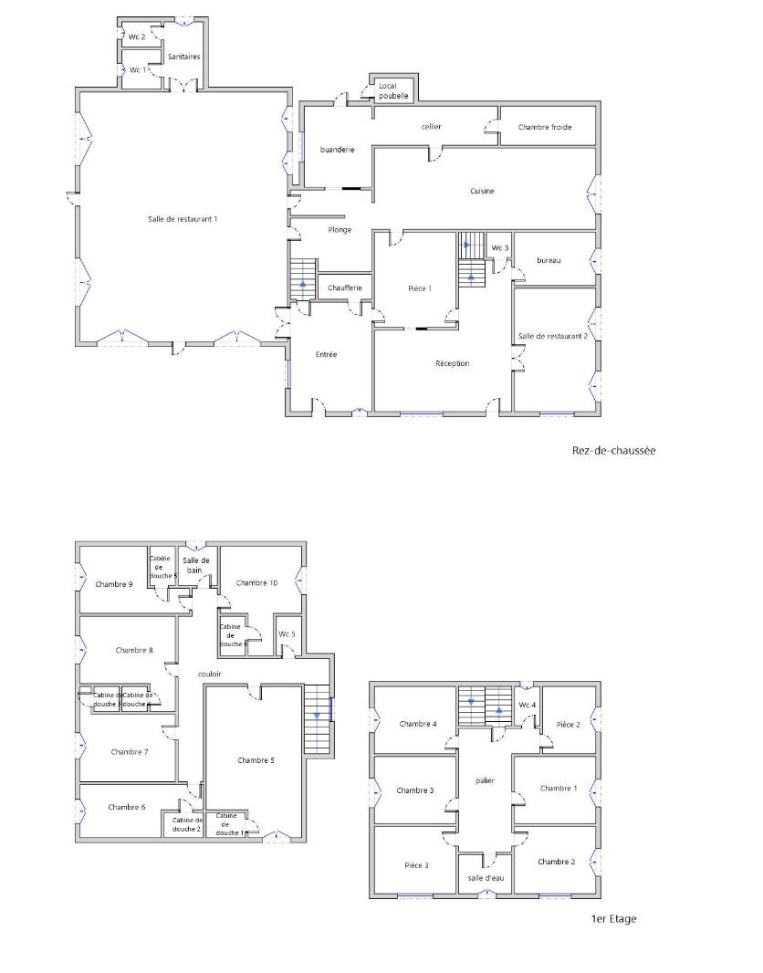 Rez-de-chaussée : vaste entrée, deux salles de restaurant, bureau, espace sanitaires, une chambre, cuisines équipées avec chambre froide, buanderie.