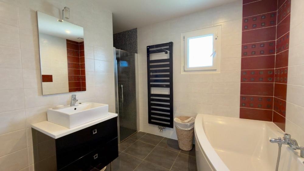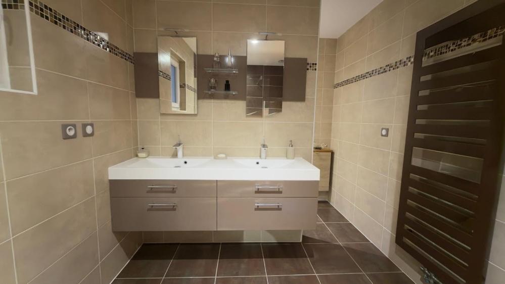 À l’étage, vous découvrirez une véritable suite parentale, pensée comme un espace privilégié : chambre, dressing avec fenêtre, grande salle d’eau lumineuse avec douche à l’italienne, double vasque et 2ème WC.