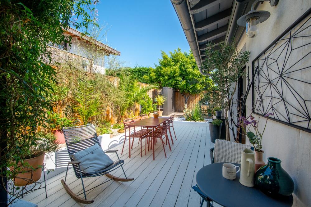 Jardin soigné avec terrasse donnant sur le salon.