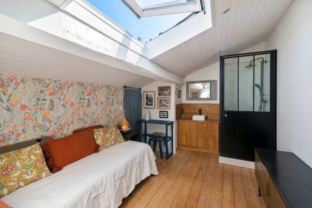 A l' étage une chambre avec une douche.
