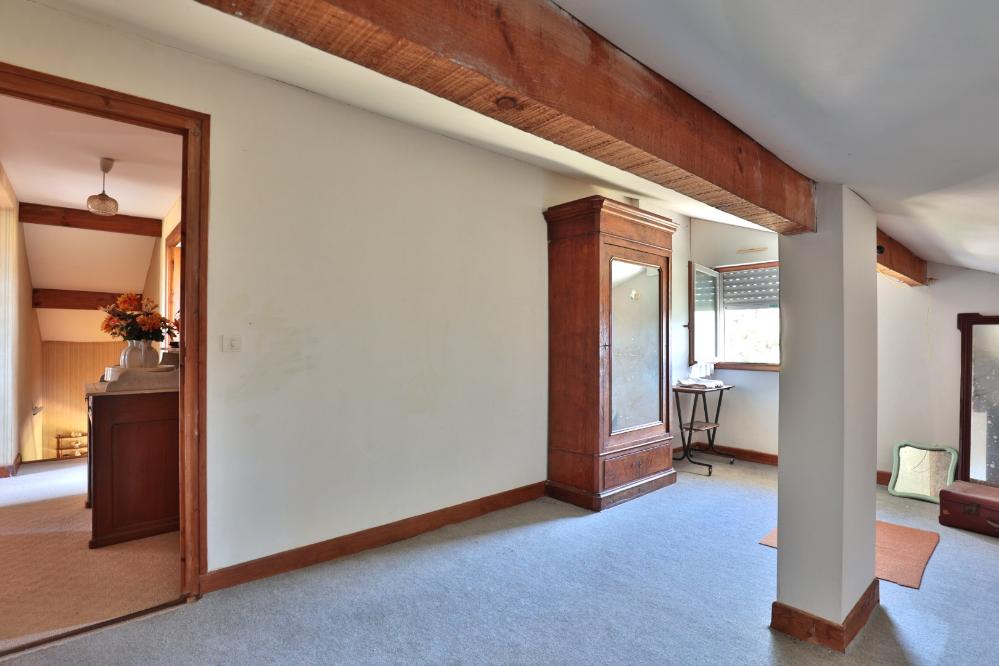 À l’étage,une salle d'eau, deux chambres dont une, donnant sur une comble qui peut être aménagée en une chambre d'enfant, une salle de jeu et donnant sur un balcon. Deux autres combles actuellement utilisées comme grenier ouvrent un beau potentiel