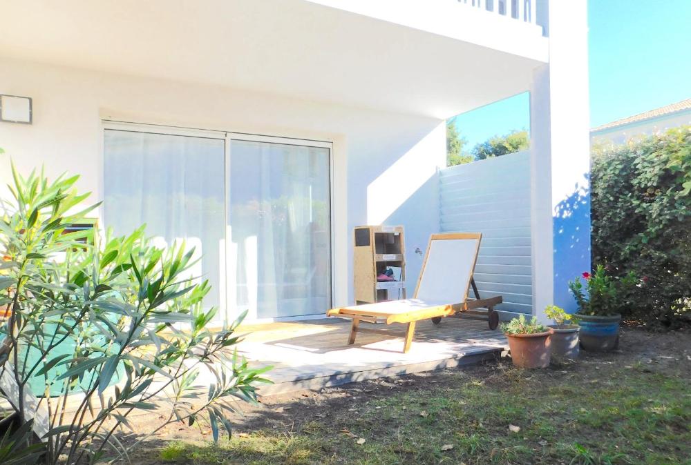 Entrée, pièce de vie exposée SUD avec cuisine aménagée. Dégagement avec placard, 2 chambres, un wc et une salle d'eau. Terrasse couverte et jardinet.