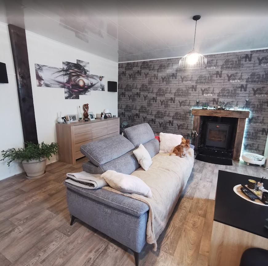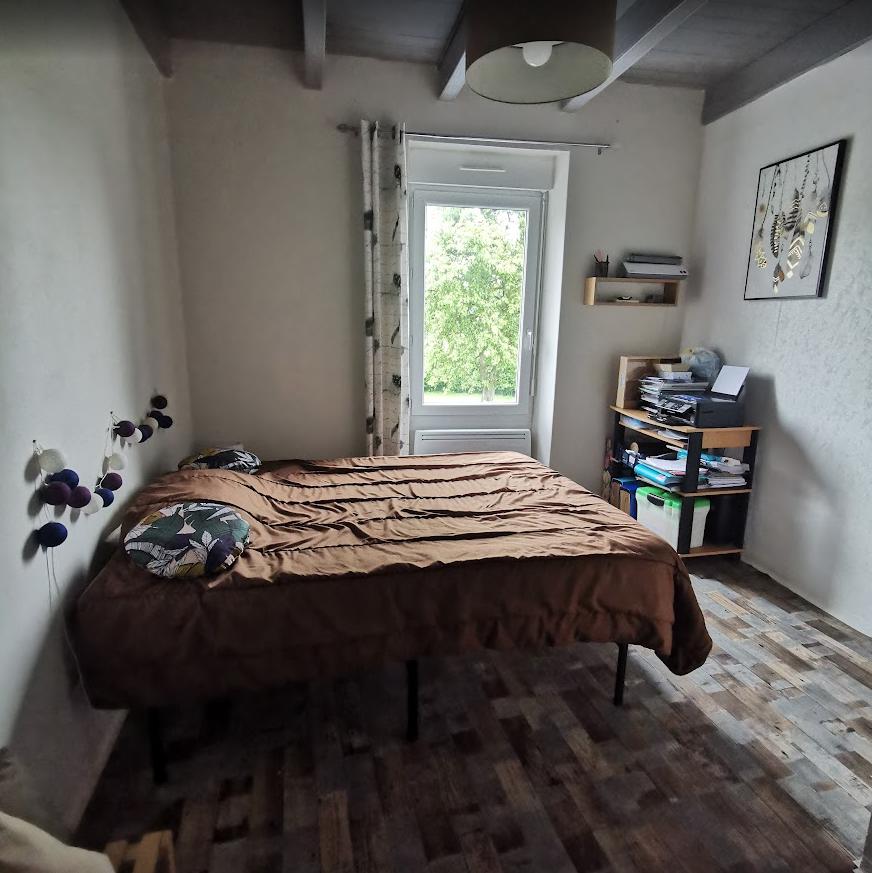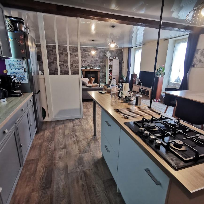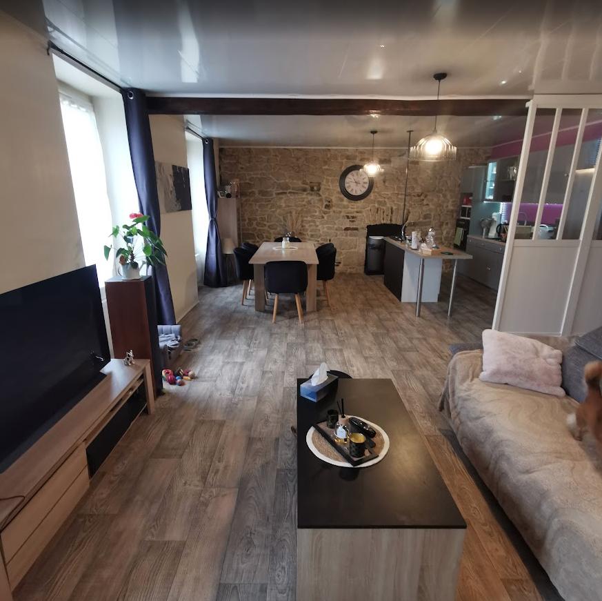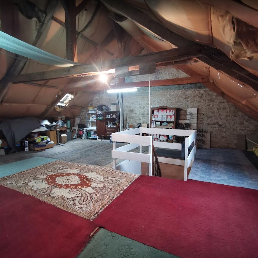 A l'étage, un appartement tout confort de type F3, de 83 m2, avec un salon-séjour-cuisine A/E de 50 m2 avec poêle à bois, 2 chambres, 1 sde et 1 wc. Au 2e étage, grand grenier à aménager avec belle hauteur sous toiture (belles possibilités).