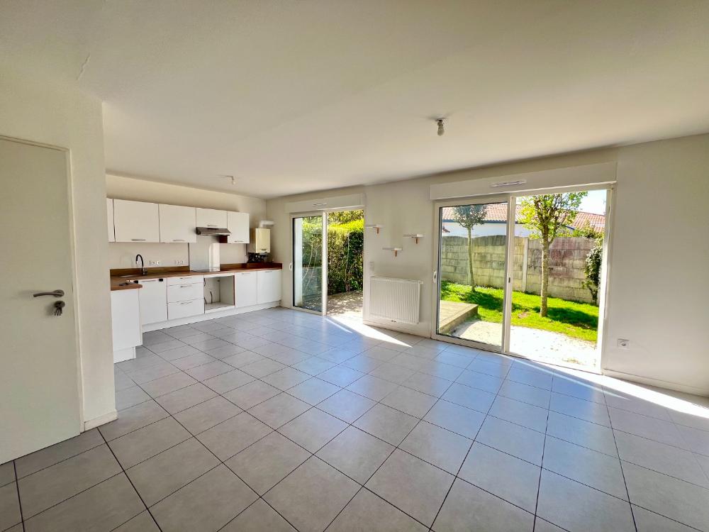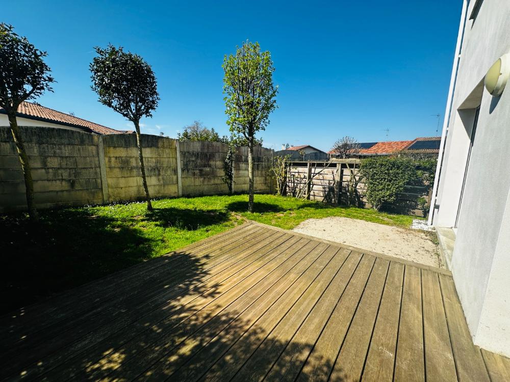 Agréable espace de vie avec séjour et cuisine ouverte, donnant sur une terrasse en bois de 11 m², un jardin de plus de 60 m² exposé Sud-Ouest. Une salle d’eau avec WC en RDC.